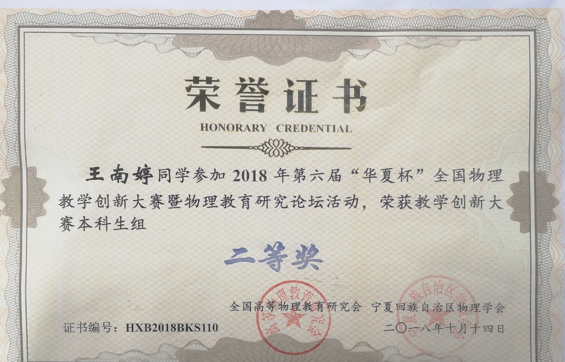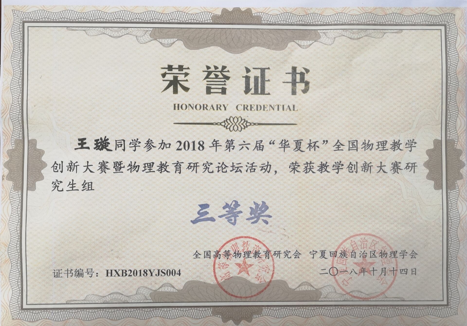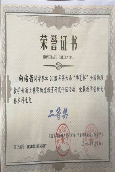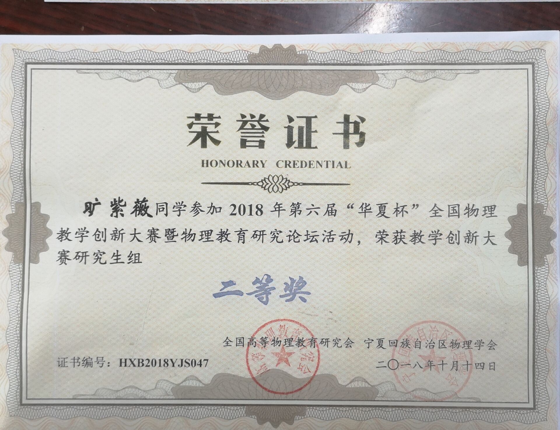 看片网 共有4名同学参加比赛并取得了优异成绩,其中本科生2名,研究生2名,向洁茜获得教学创新大赛本科生组二等奖、王南婷获得二等奖,旷紫薇获得教学创新大赛研究生组二等奖、王璇获得三等奖,我校荣获优秀组织奖,此次带队老师为看片网 物理系唐京武老师。