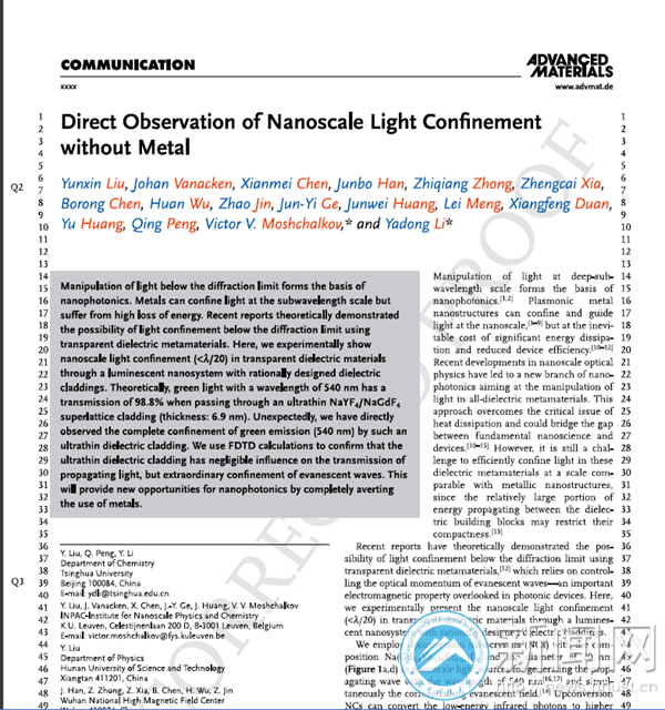 刘云新副教授在国际权威期刊《先进材料》(Advanced Materials,影响因子21.95)杂志上发表一篇题为《Direct observation of nanoscale light confinement without metal(纳米尺度光约束的直接观测)》论文。该研究前期相关研究成果在2013年发表《Angew. Chem. Int. Ed.》(影响因子:13.734)上,入选ESI前1%高被引论文。