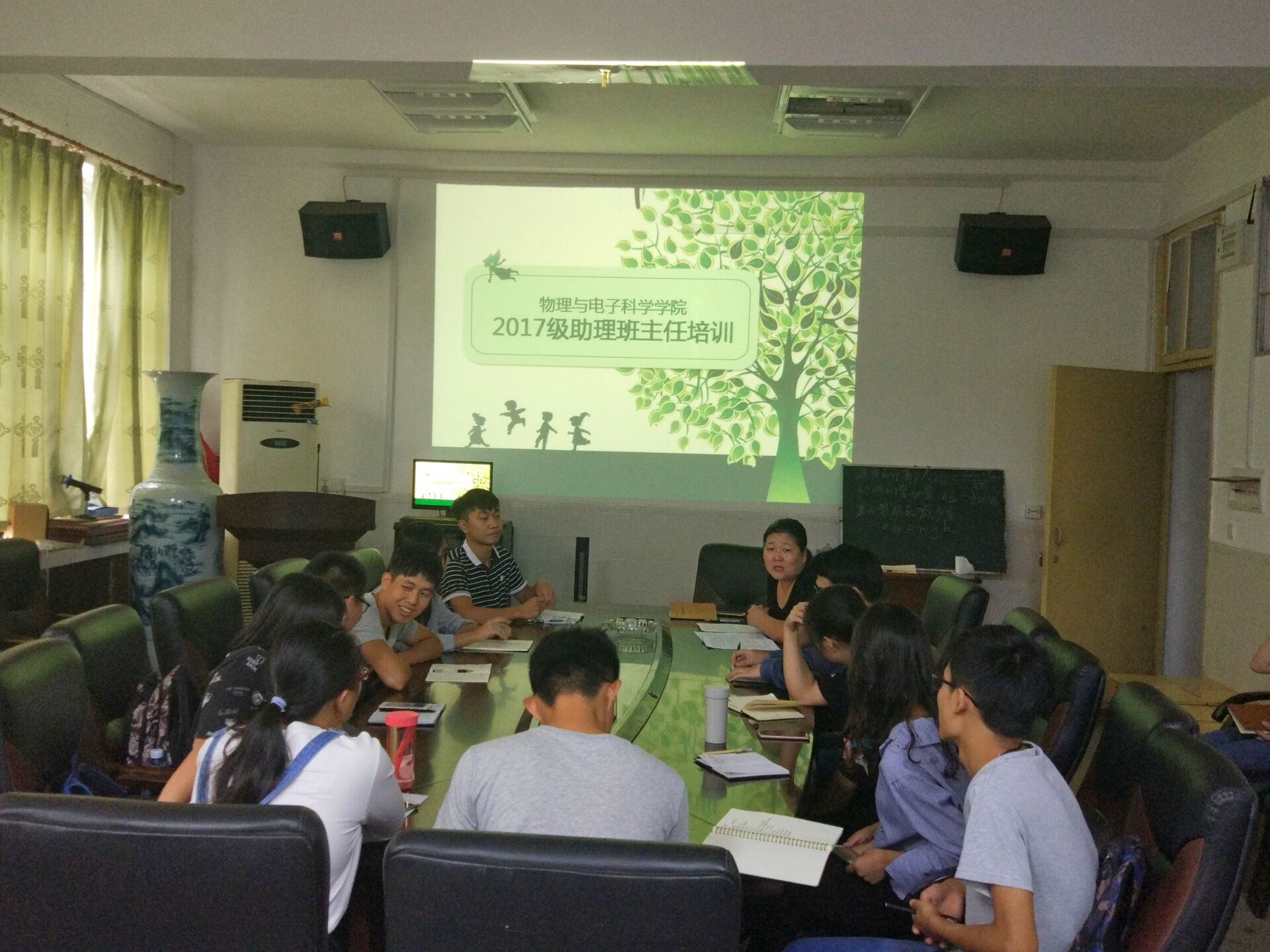 为使即将到来的新生开学报到工作有效地进行,9514:25分,2017级助理班主任培训大会在物理楼二楼会议室成功召开。全体助理班主任与会,学工办孙婵老师、张华老师出席进行指导。