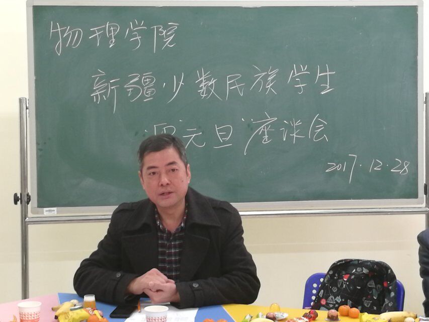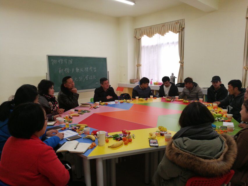 于物理楼102举行了新疆少数民族学生迎元旦座谈会。院党委书记周文革、党委副书记杜鑫、学工办所有老师以及特邀嘉宾阿扎旦老师出席了此次座谈会。