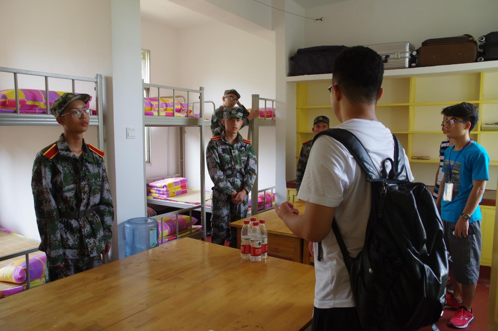 上午军训任务结束后,稍作休息后教官如约来到寝室进行指导工作。尽管19级学子身体劳累,他们仍认真地向教官学习。教官首先对宿舍内务的标准要求进行了详细讲解,随后耐心细致地向新生进行了叠军被分布讲解演示:折叠、压缝、整角,一系列动作完整流畅。讲解及实际演示工作完成后,在新生的邀请下,教官热情走访各个寝室,对部分新生宿舍的卫生情况、桌面和床上用品进行规范整理。在此期间,党委副书记杜鑫、19级辅导员任朋飞、主席团全体成员也来到寝室向大家指出内务检查的重点,让志愿者对接下来的寝室卫生进行检查并记录。
