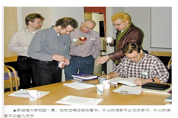 充分利用吃饭的时间学习,也是世界一流大学的普遍现象。这里讲一个我在斯坦福的一次经历。2011 2 月的一天午饭时间,我打好饭一个人坐在一张空桌子上。一位亚裔学生端着饭问我是否可以跟我坐在同一张桌子上,这也是美国人的一种礼貌,遇到这种情况都要征求一下先坐下者的意见。我当然同意了。当时我心里在想,看看这位学生会不会拿出书来边吃边看。果不其然,这位同学一坐下就马上拿出一本书来,边吃边看,一直到我走的时候,都还是低着头。这种事情在这里太正常了。